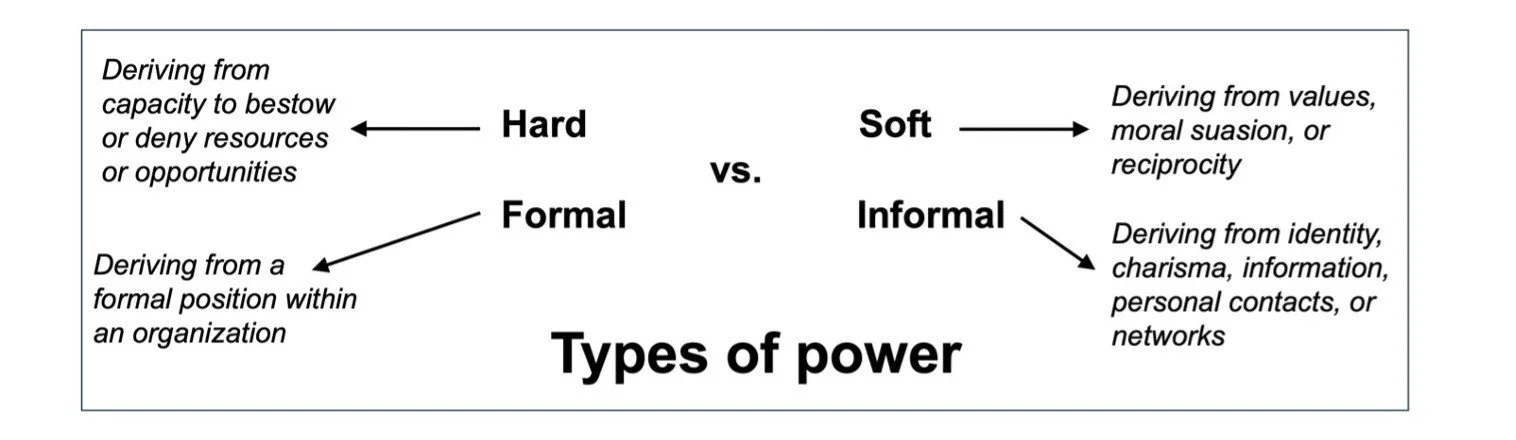 In institutions, formal power is derived from a position such as department chair, dean, provost, or president while informal power does not depend on a (current) position but rather derives from identity, charisma, contacts, and networks. Of course, these bases for informal power may also contribute to the power of an individual holding a formal position. Furthermore, individuals who have left a formal position often retain networks and access to information that contribute to their subsequent informal power. Since individuals in formal positions of power are often able to allocate (or deny access to) resources and opportunities, they are more able to wield hard power. In academic settings (which are expected to be collegial), the efficacy of hard power may be compromised by the resentment it can generate. Thus, soft power cannot be ignored even by those in positions of formal power, and it is even more important for the exercise of informal power.